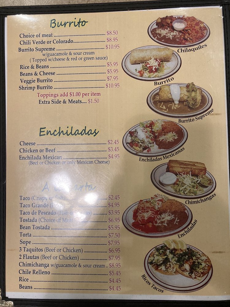 It consists of rice, beans, cheese, and choice of meat inside. Topped with red or green sauce, melted cheese, sour cream, and guacamole.